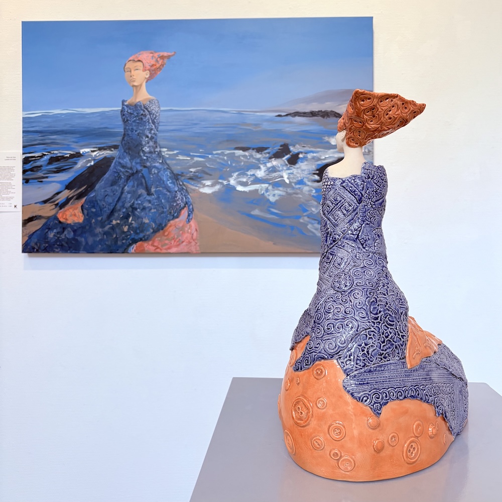 Lynette complements this sculpture with a large acrylic painting on canvas, depicting the same woman within a vast seascape. Note that the sea connects continents. The interplay between painting and sculpture creates a dynamic dialogue between the disciplines.