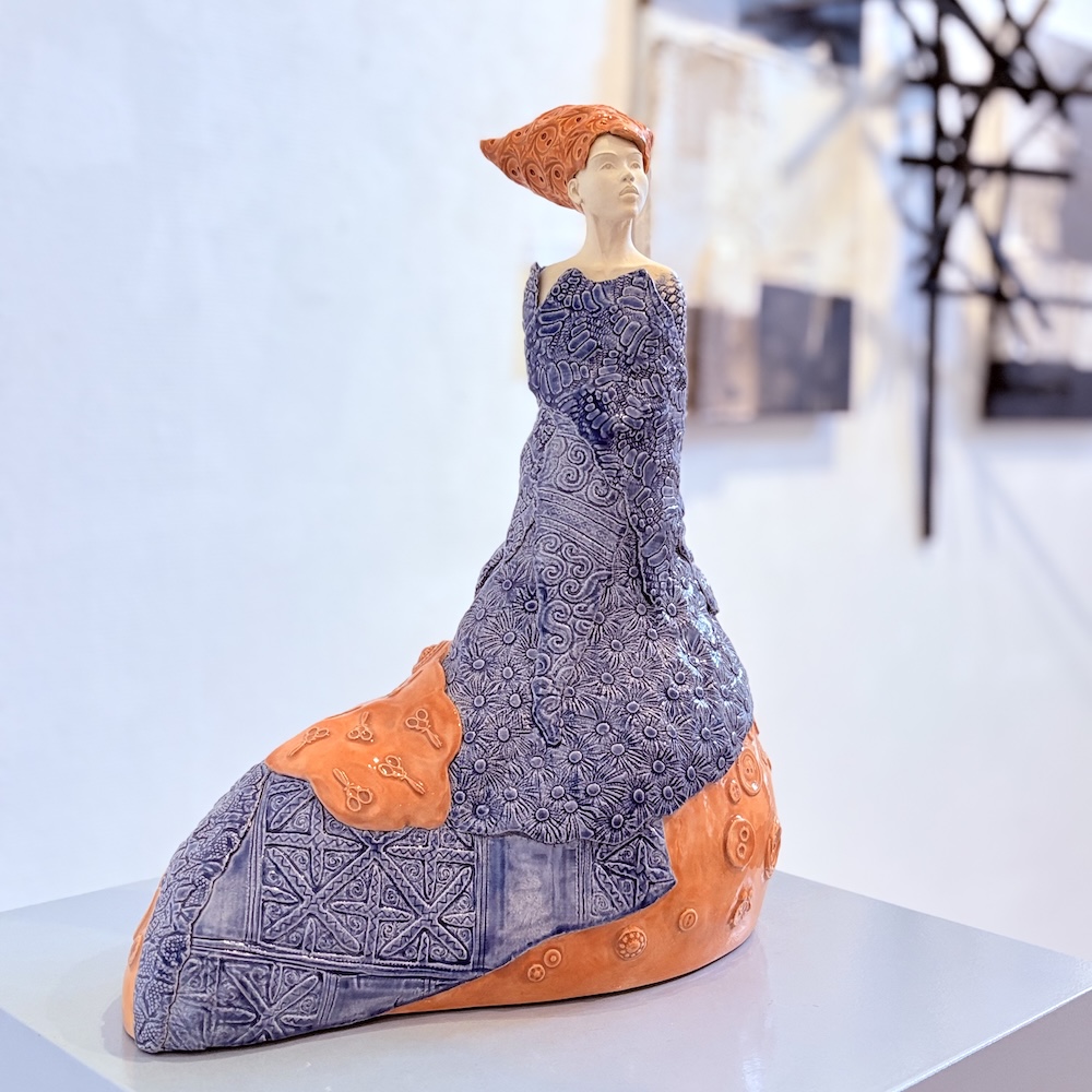 Their collaborative work brings this theme to life through the depiction of a woman as a rock amidst the waves. Petra’s signature ceramic sculptures of strong women play a central role. In the sculpture “Language in Texture,” she brings together handicrafts created by women from various continents. The use of color is reminiscent of Delftware, giving the sculpture a Dutch foundation.